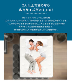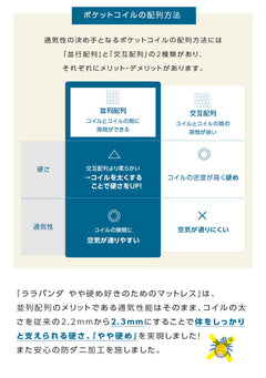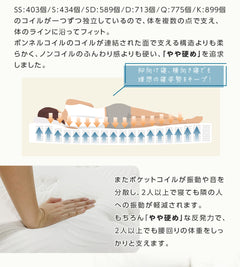 マットレス種類:ポケットコイルマットレス、コイル直径2.3mm、コイル高さ19cm、コイル数434/589/713/775/899個、並列配列